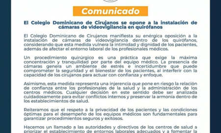 Santo Domingo. – El Colegio Dominicano de Cirujanos (CDC) expresó su desacuerdo con la propuesta de instalar cámaras de vigilancia en los...