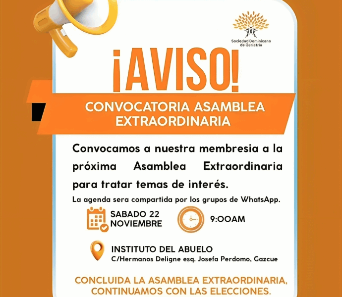 Santo Domingo. – La Sociedad Dominicana de Geriatría (SODOGE) invita a todos sus miembros a participar en la Asamblea Extraordinaria que se...